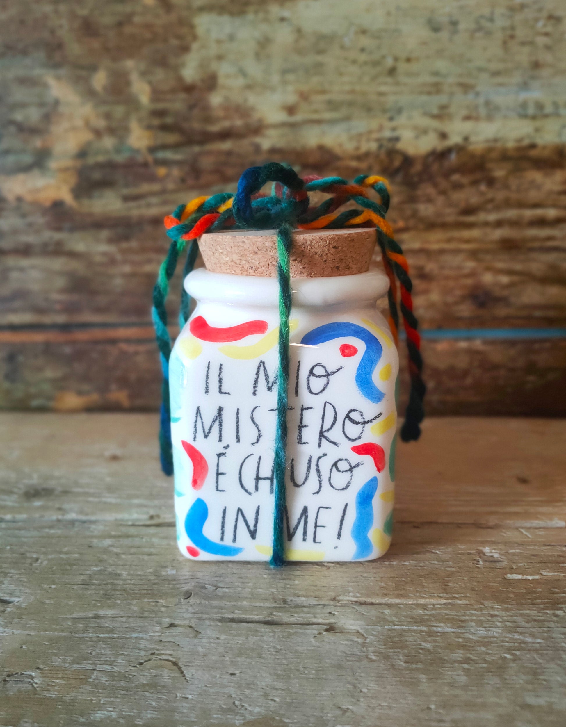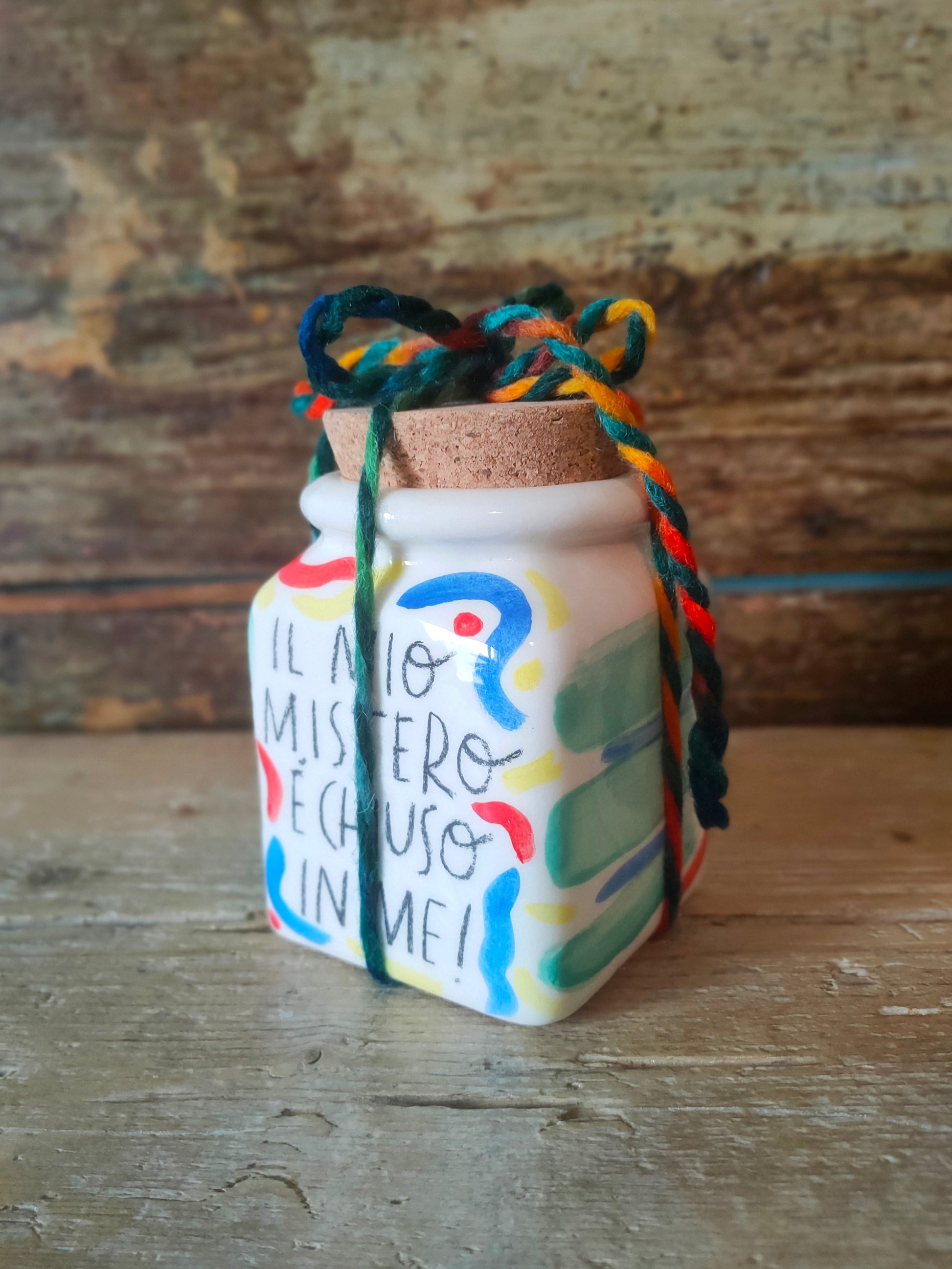 Barattolino "Il Mio Mistero è Chiuso in Me" in Ceramica Dipinta a Mano. Scritta Nera.