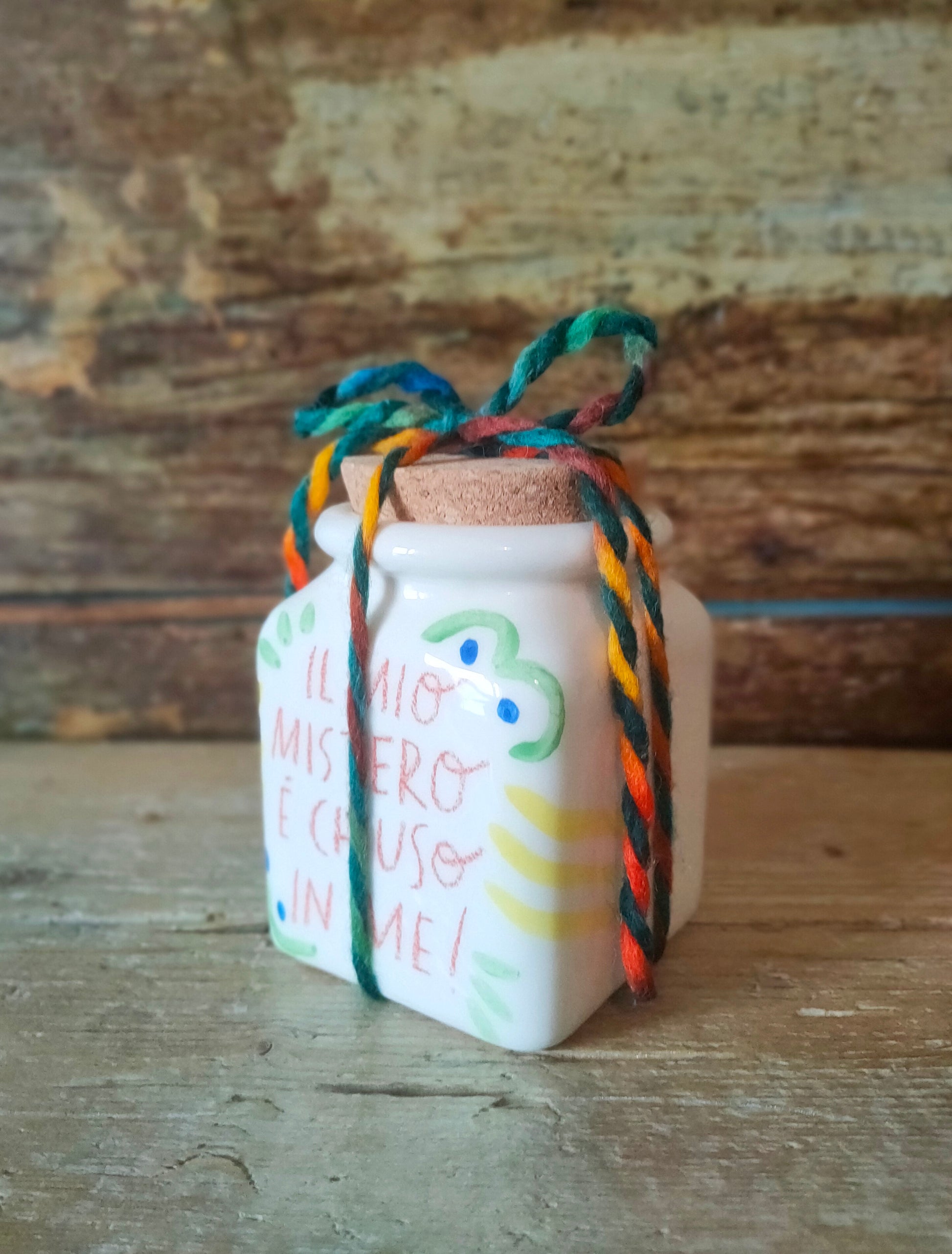 Barattolino "Il Mio Mistero è Chiuso in Me" in Ceramica Dipinta a Mano. Scritta Rossa.