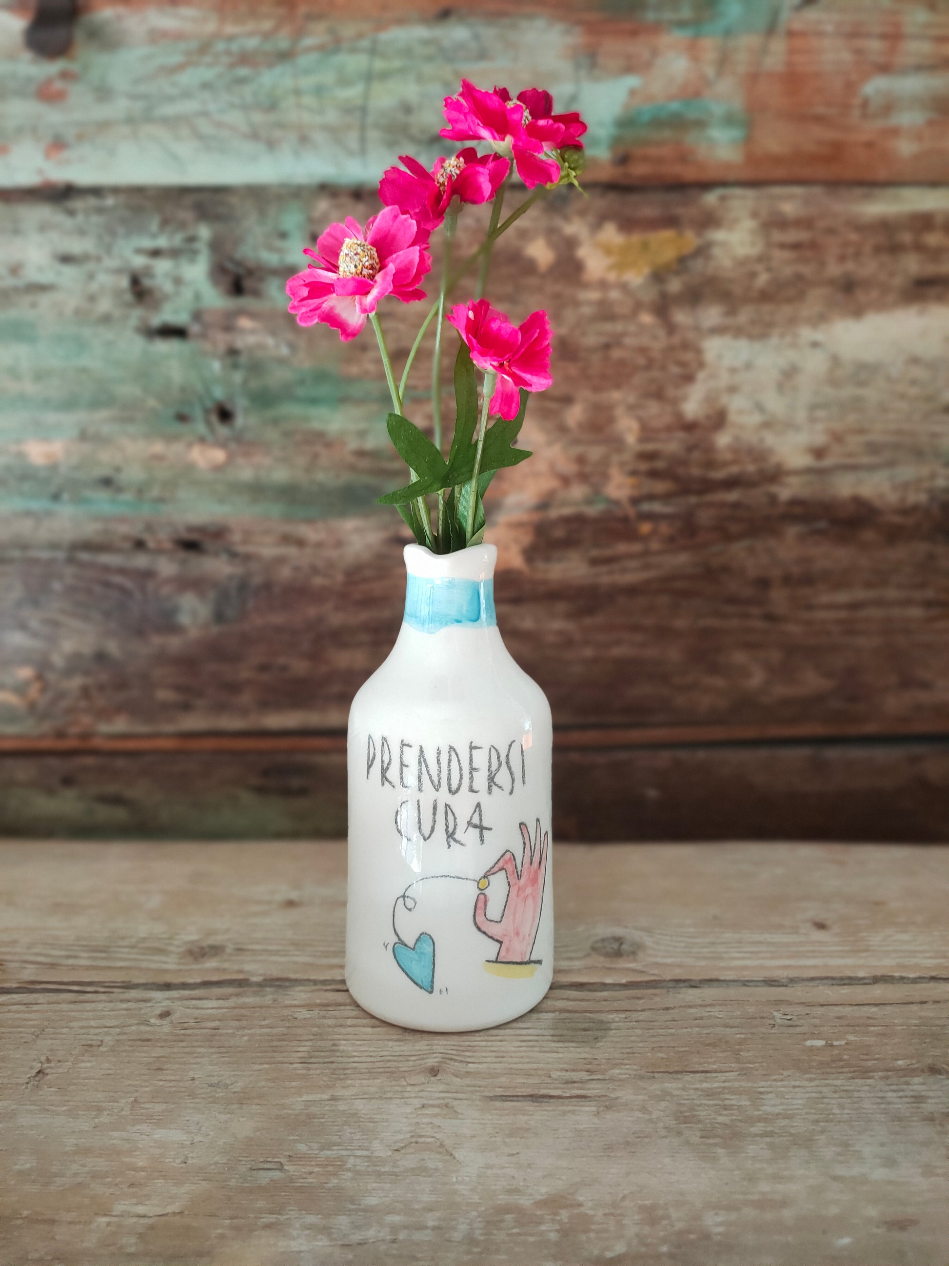 Bottiglietta in Ceramica Dipinta a Mano "Prendersi Cura" *Azzurro*