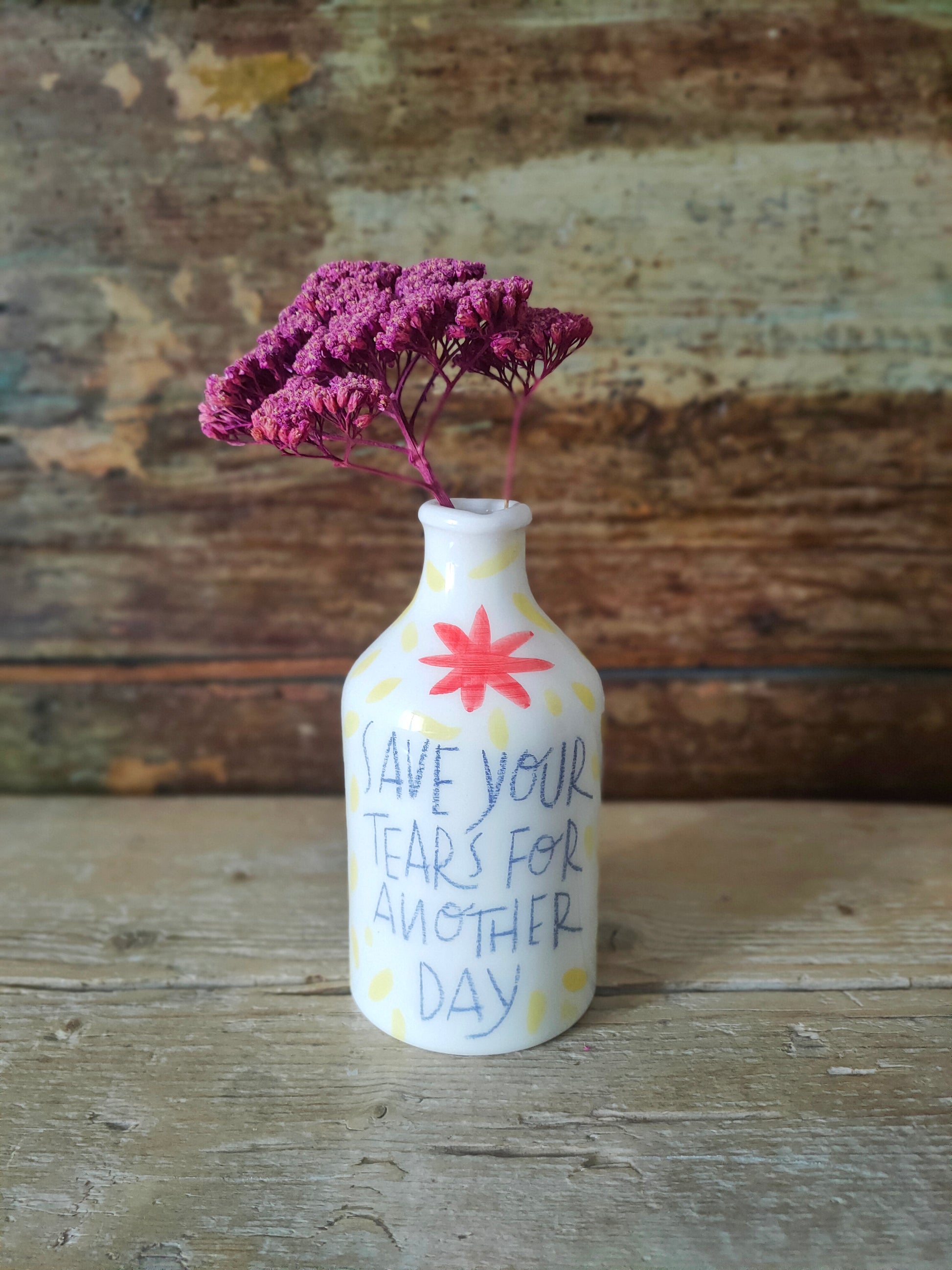 Bottiglietta in Ceramica Dipinta a Mano "Save Your Tears" scritta blu