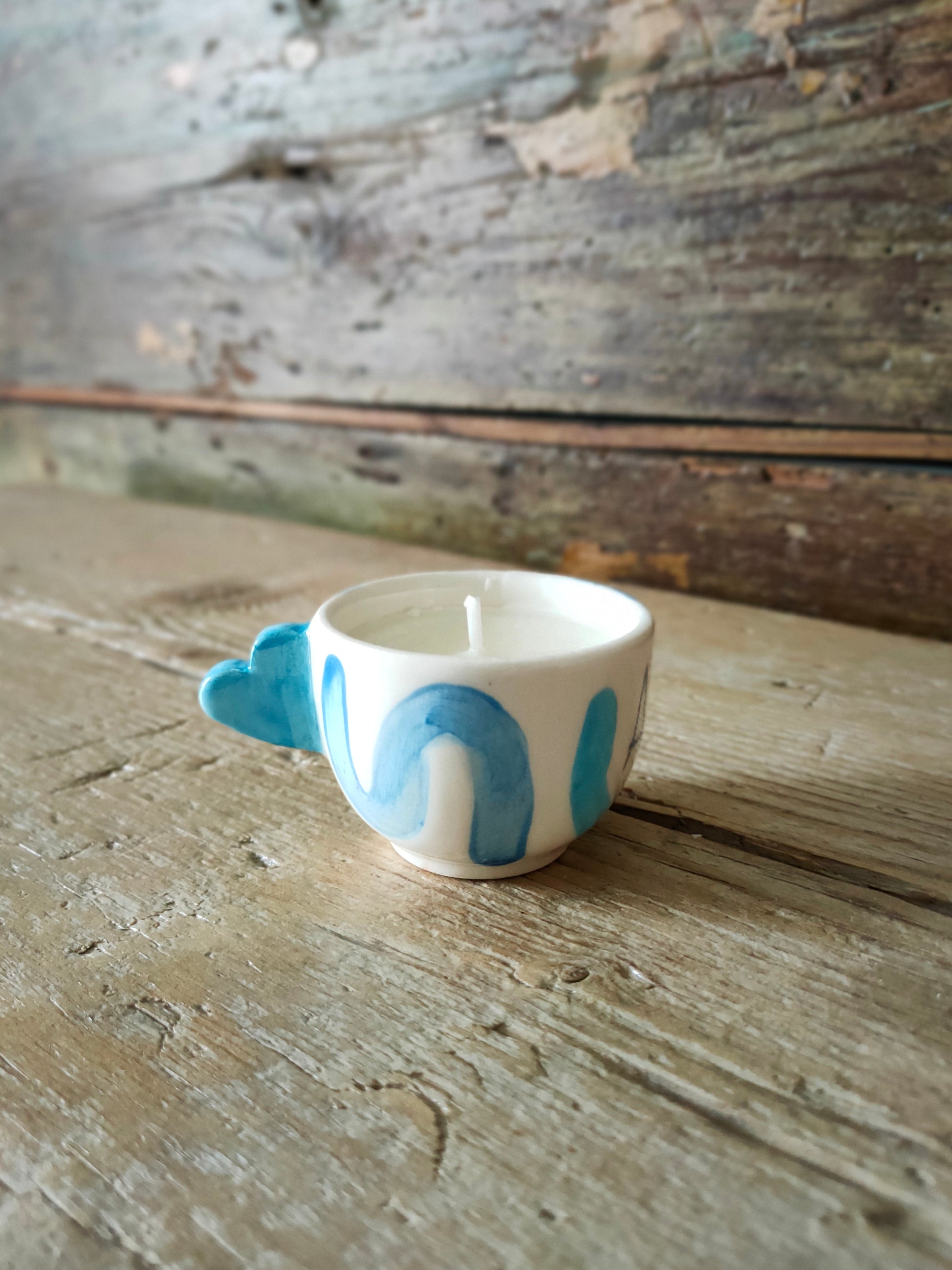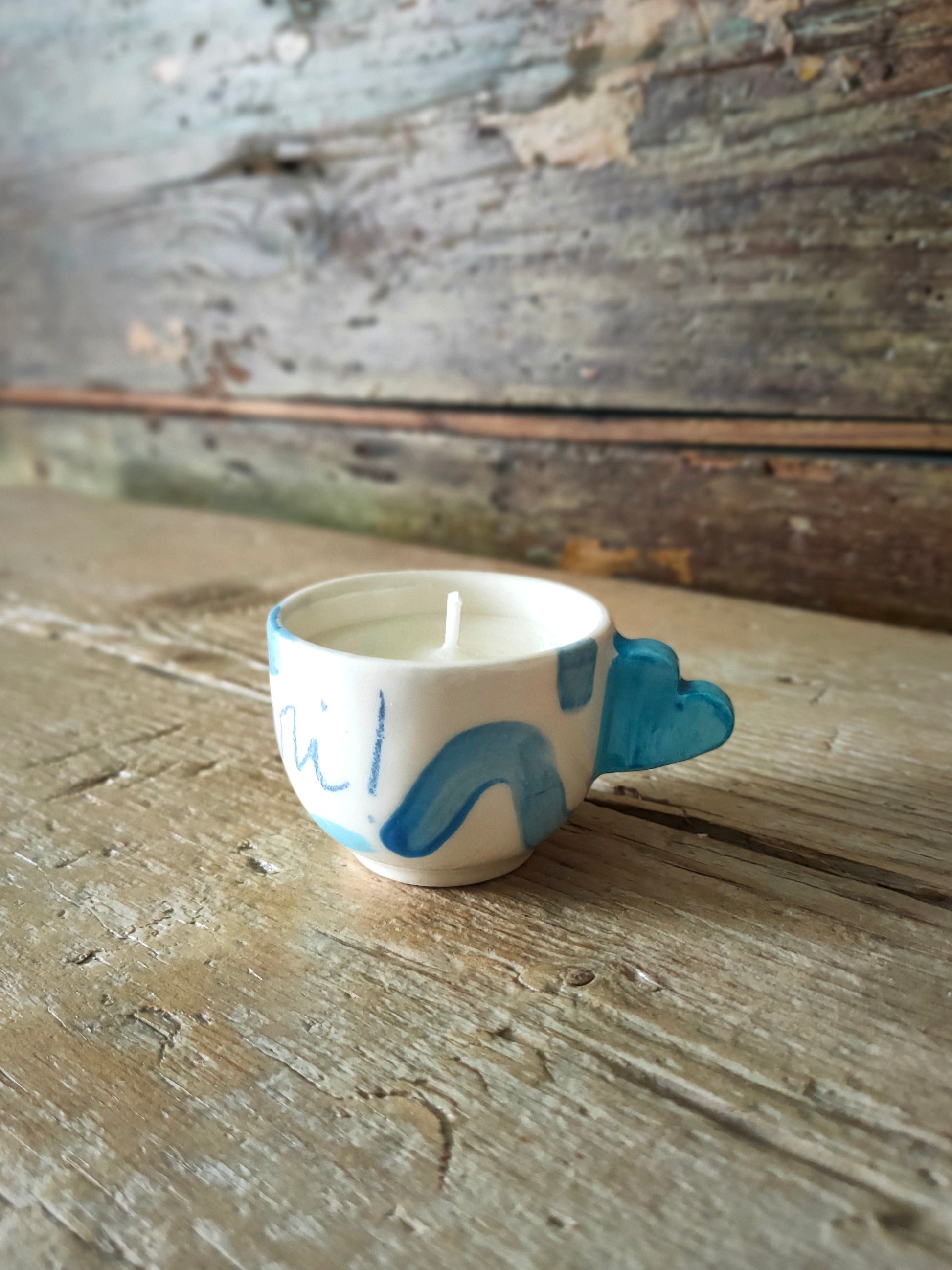 Candela Imperfetta Tazzina Con Cuore Azzurro "Auguri"