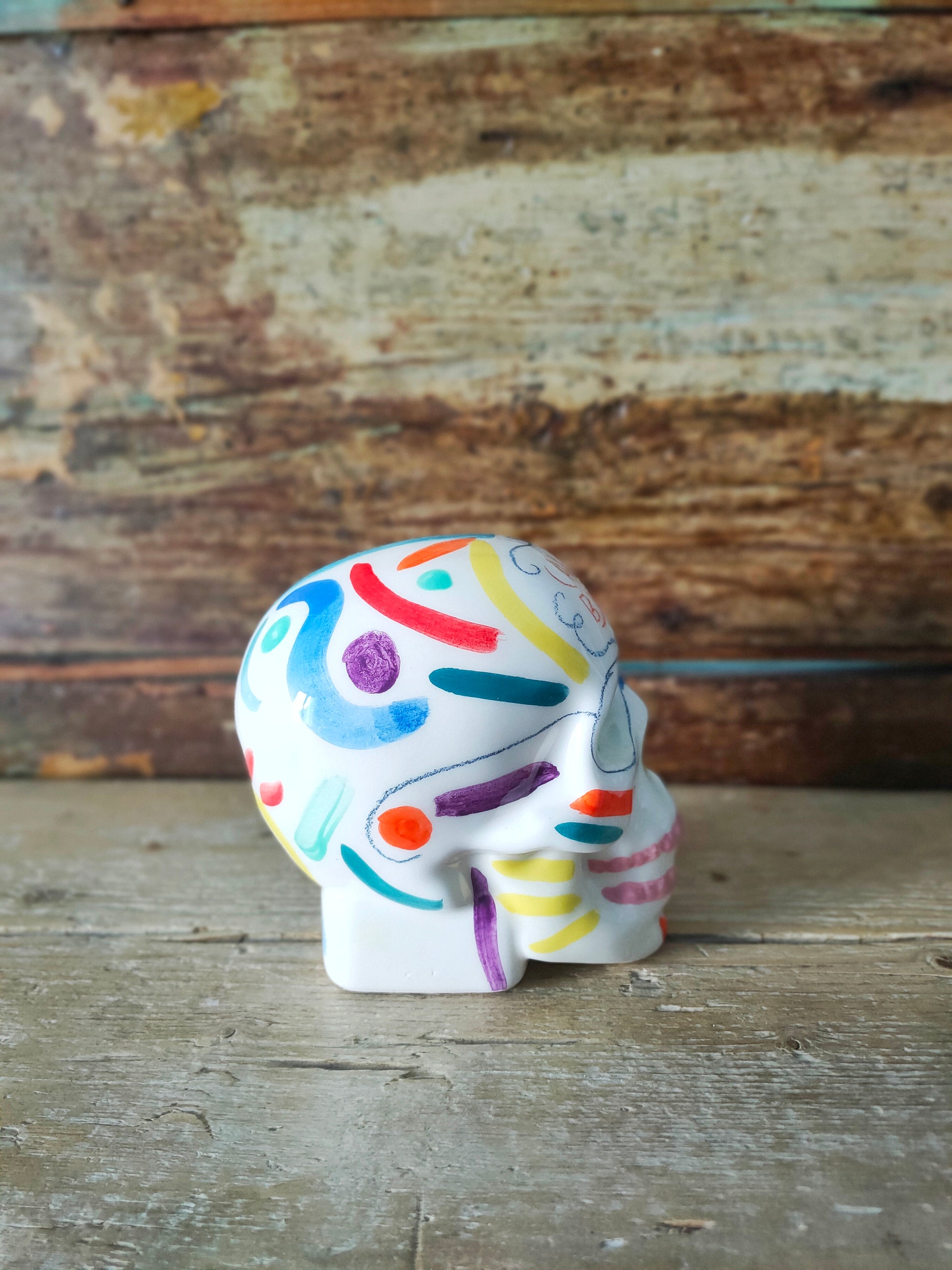 Si si si!!! Fluoriscilla ha creato la sua linea "calavera" di ceramica. Una serie di teschi che più che un'immagine macabra, sono un oggetto propiziatorio e di buon auspicio. I colori sgargianti cacciano le vibrazioni negative e attirano quelle positive! Da posizionare in casa come allegri suppellettili!!! COLLEZIONALI TUTTI!!