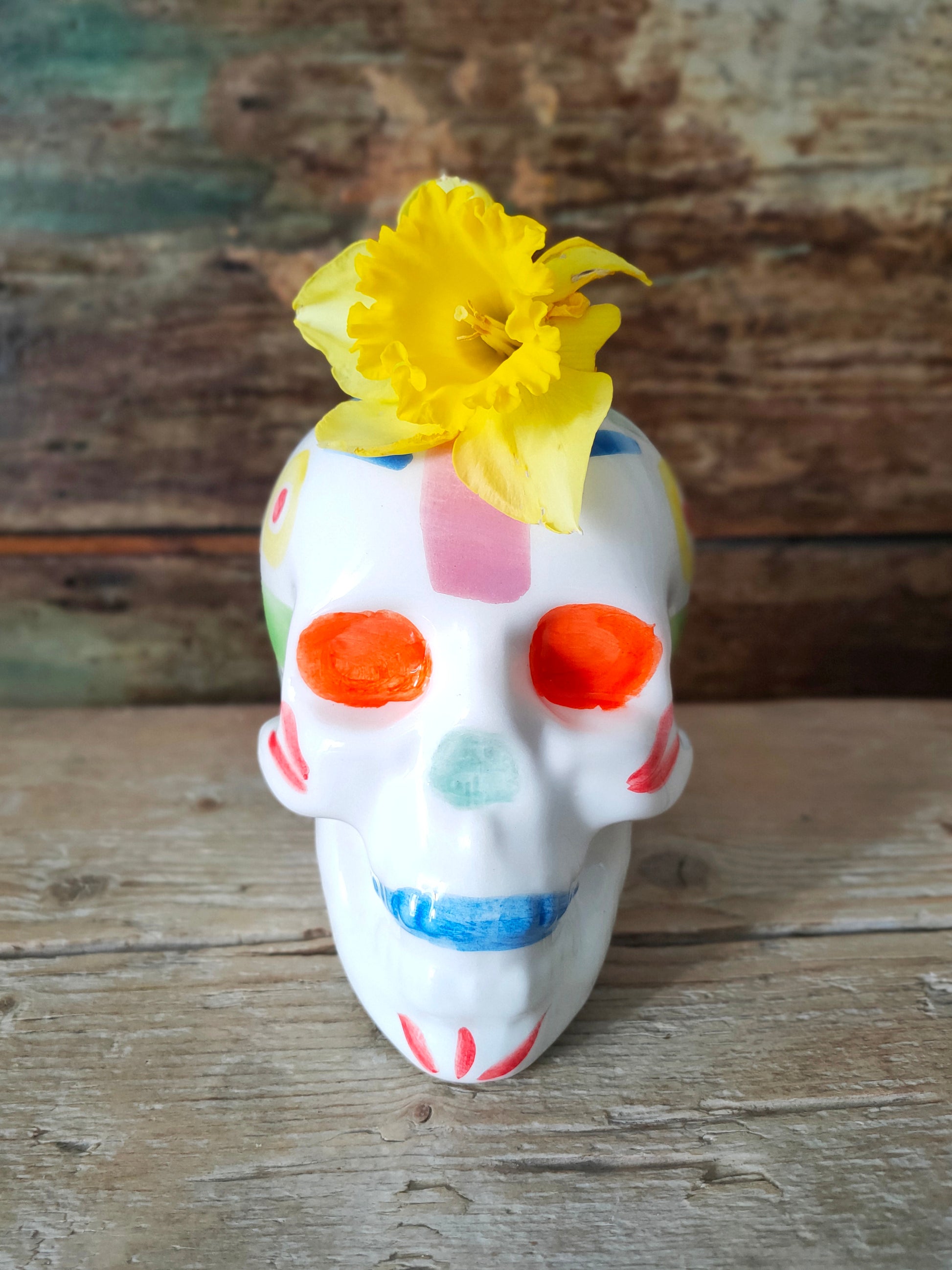 Si si si!!! Fluoriscilla ha creato la sua linea "calavera" di ceramica. Una serie di teschi che più che un'immagine macabra, sono un oggetto propiziatorio e di buon auspicio. I colori sgargianti cacciano le vibrazioni negative e attirano quelle positive! Da posizionare in casa come allegri suppellettili!!! COLLEZIONALI TUTTI!!