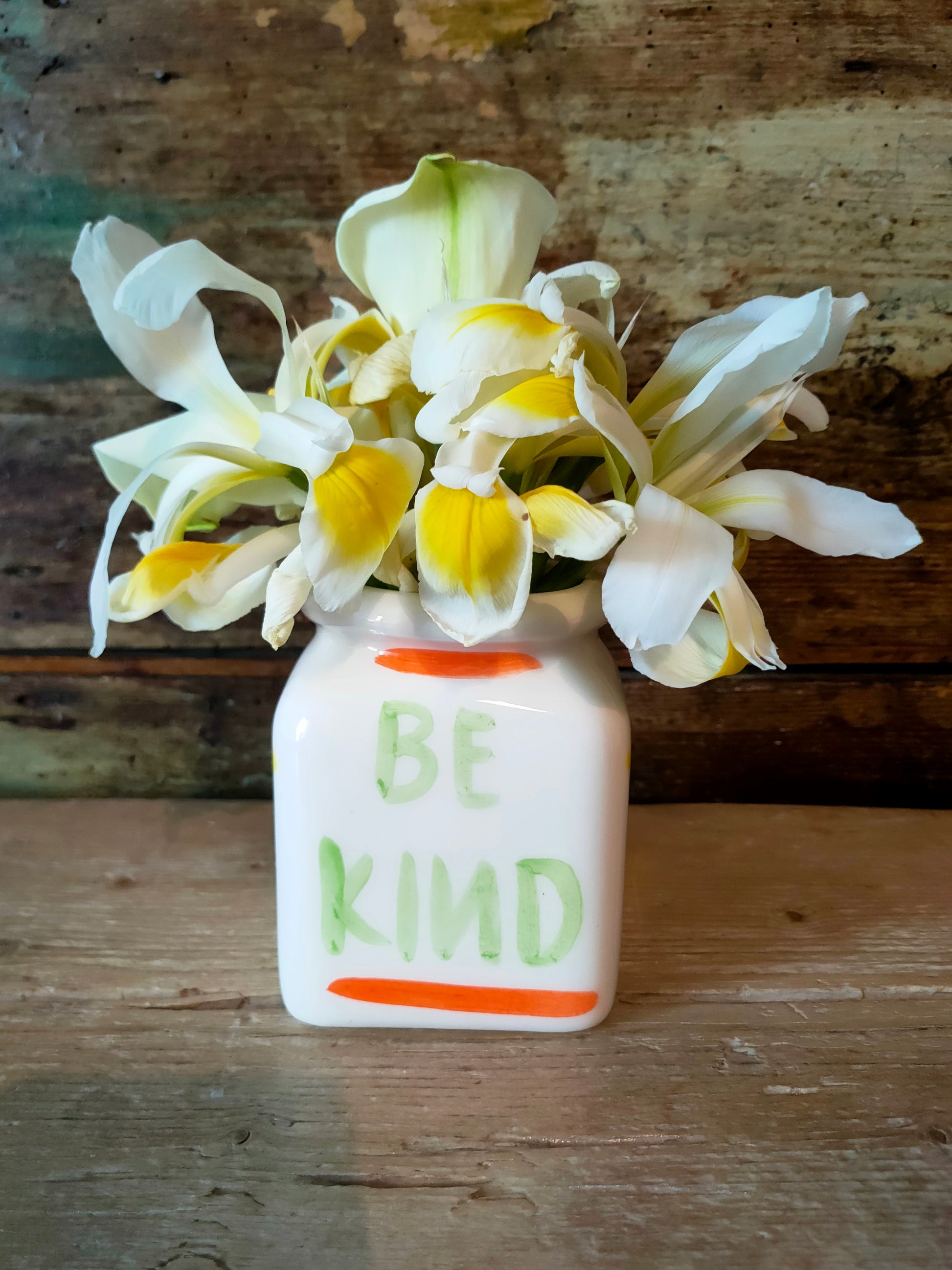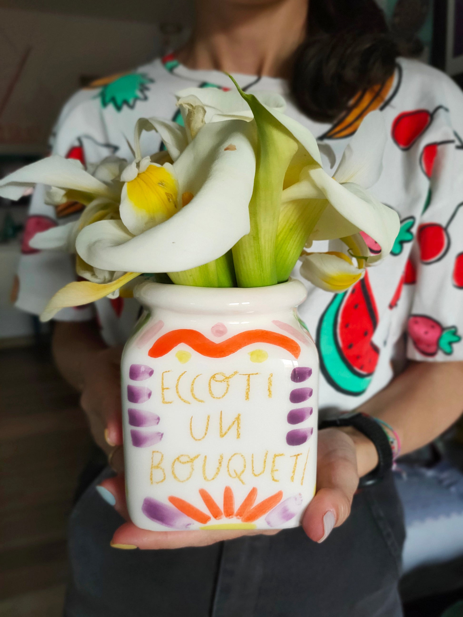 Vaso per fiori "Bouquet" piccolo, scritta arancio, in Ceramica Dipinta a Mano.